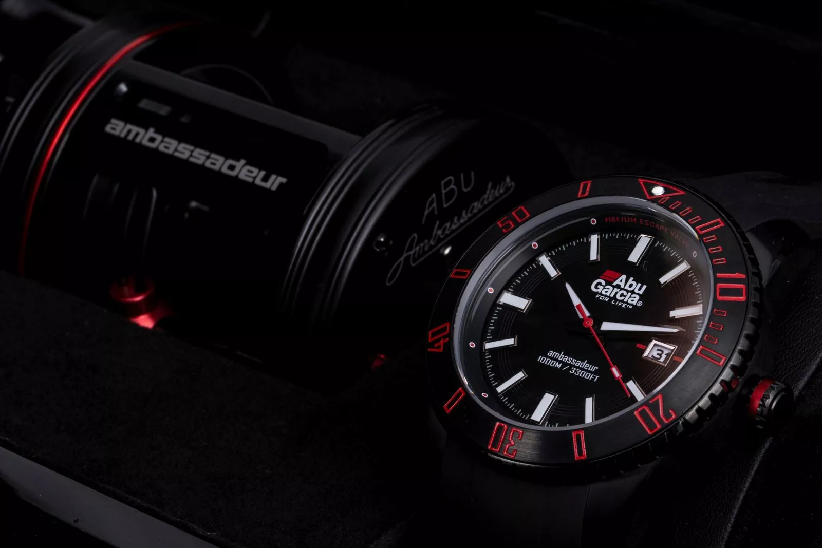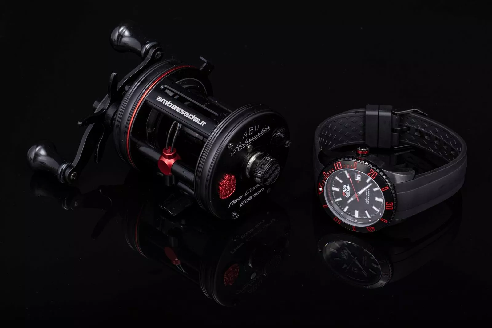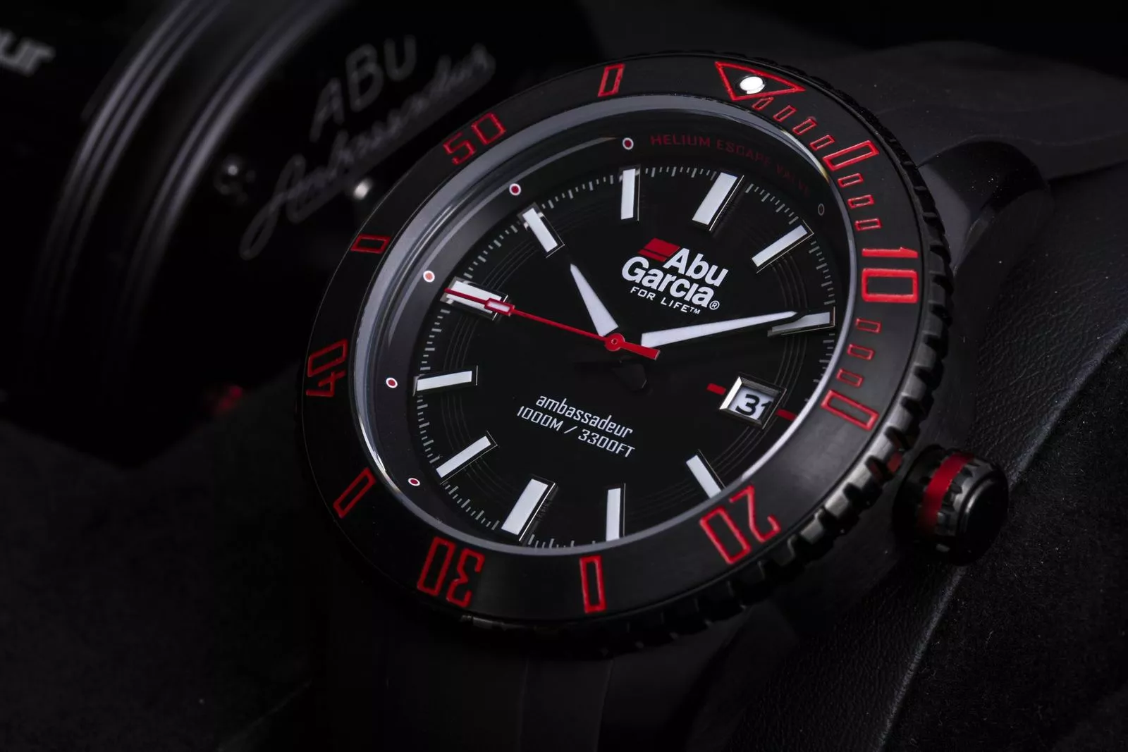 The ABU Ambassadeur Edition watch features a Quartz movement with date indicator and has a comfortable rubber strap. The 45mm case is