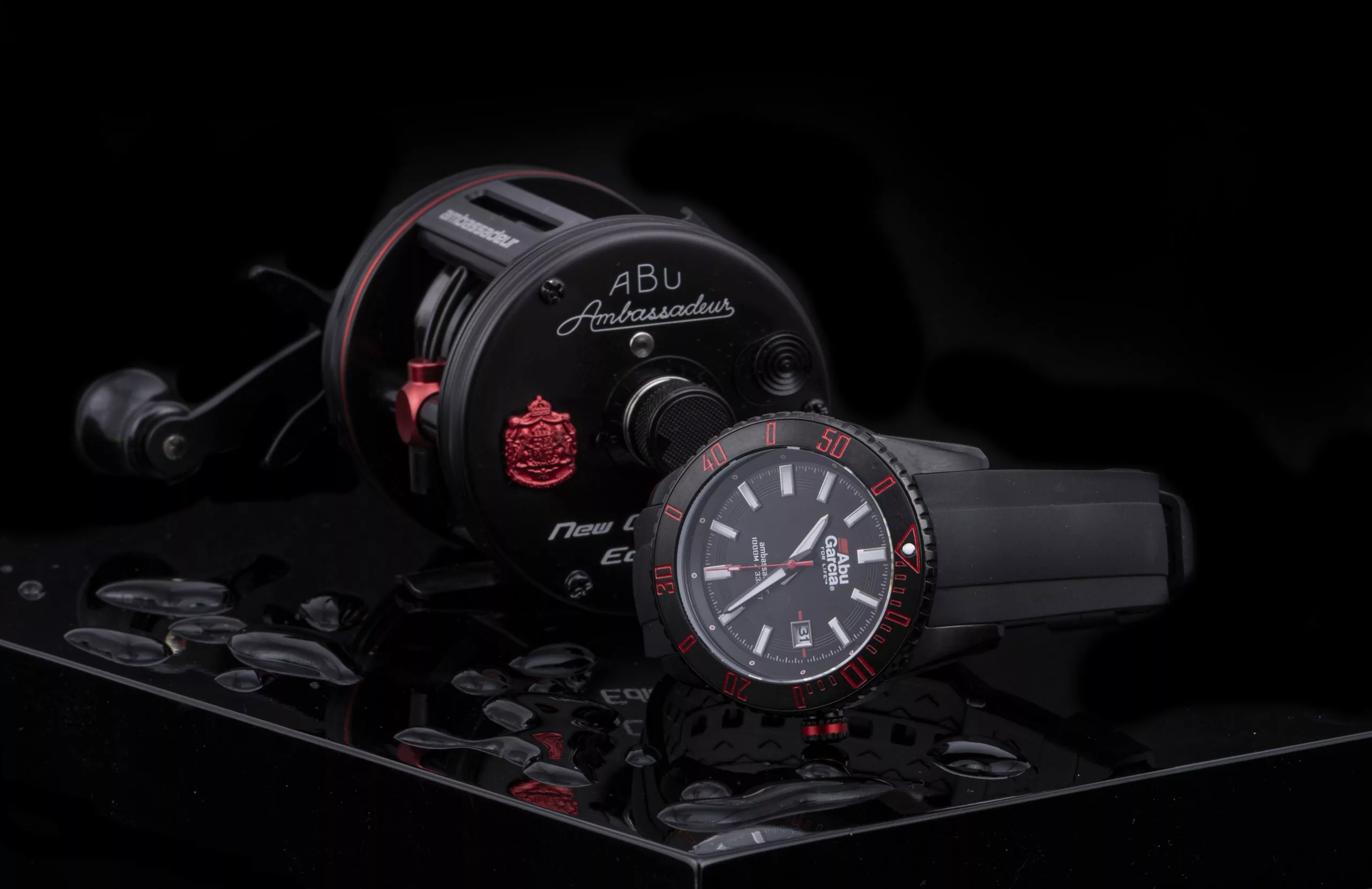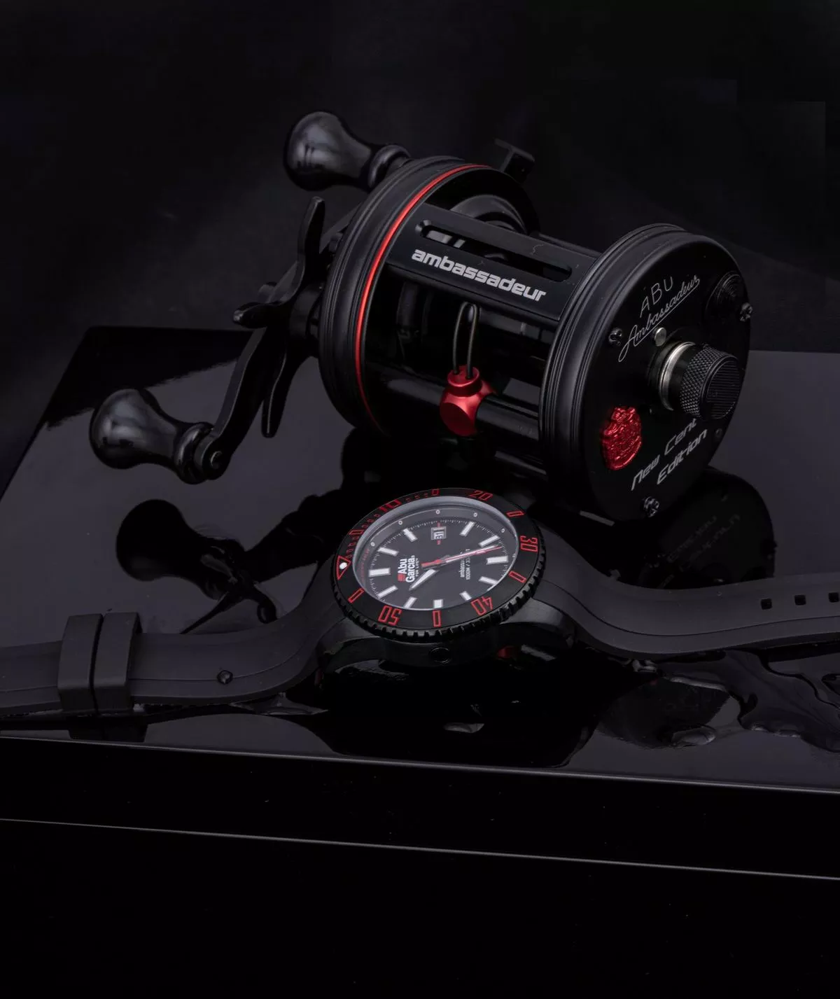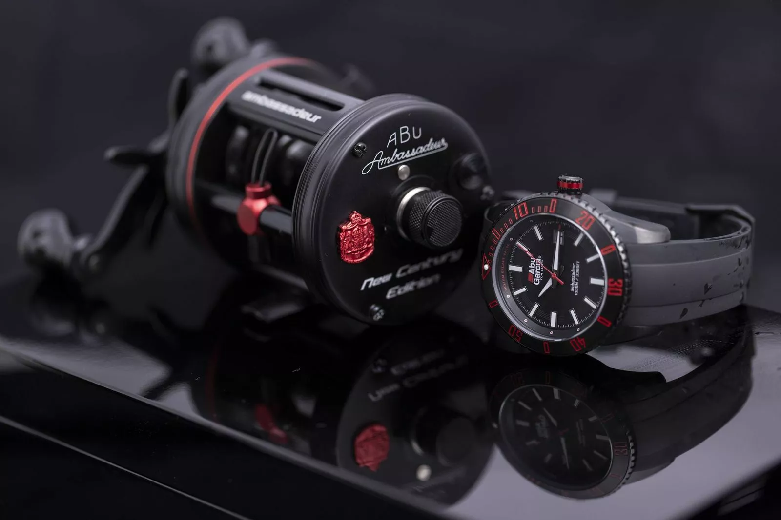 The ABU Ambassadeur Edition watch features a Quartz movement with date indicator and has a comfortable rubber strap. The 45mm case is