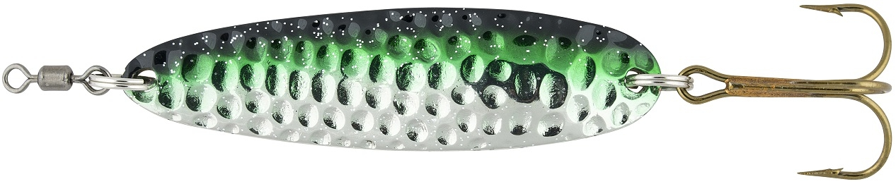 Abu Garcian Hammer-lusikan vasaroitu pinta päästää veteen houkuttelevia ääni- ja valosignaaleja. Hammer-lusikka toimii hyvin niin rannikolla,kuin järvissä ja joissakin. Paino:15g, väri:Green/Glitter