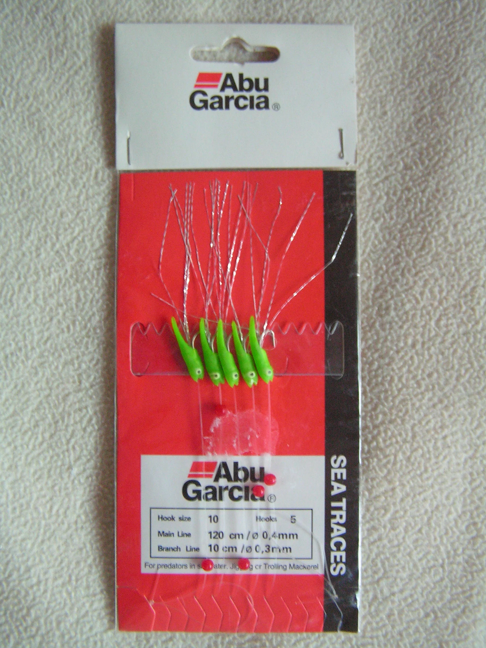 Abu Garcian -merilitka, 5kpl vihreitä jigi-runkoisia koukkuja, joissa hopeaa flashabouta pyrstöinä, koukun koko:10, pääsiiman vahvuus/pituus: 0.40mm/120cm, litkasiiman vahvuus/pituus:0.30mm/10cm.