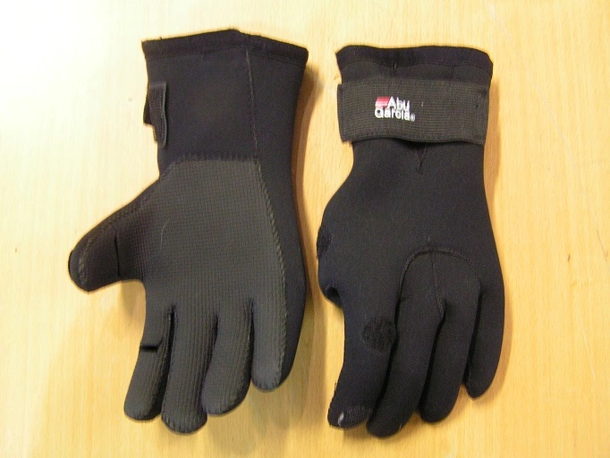 Abu Garcia neopreeni-käsineet, ranteissa tarrakiristys ja peukalon ja etusormen kärjen voi taittaa tarrakiinnitykseen, jolloin sormen kärjet ovat vapaina.