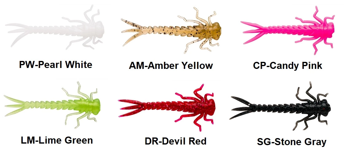 Neljä hajustetta kohdekalalajin mukaan, kolme eri muotoa (Spike Tail, Dragonfly Nymph ja Mayfly Big Nymph) ja 6 väriä DM Devil Red – punainen, PW Pearl White – valkoinen, CP Candy Pink – vaaleanpunainen, SG Stone Gray – harmaa/musta, AY Amber Yellow – vaalean ruskea ja LM Lime Green – limevihreä.