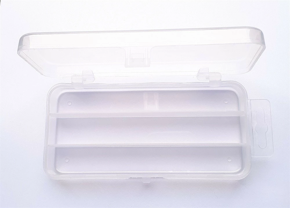 Pieni muovirasia, jossa kolme lokeroa perhoillesi tai muille vieheille. Mahtuu kätevästi taskuihin. Koko:6x13cm.