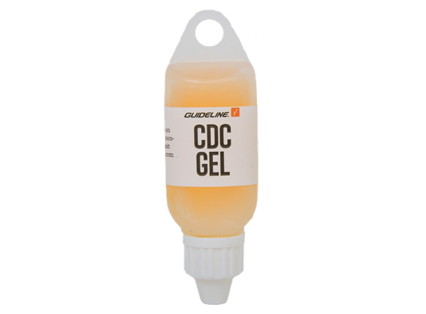 This our own CDC Oil and Gel dry fly floatant. They come in a very clever bottle with an extension in the bottom with a hole, so you can hang it upside down without any extra accessories.