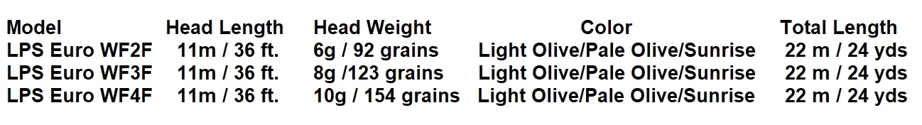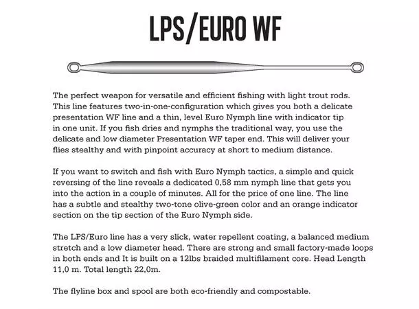The LPS/Euro line has a very slick, water repellent coating, a balanced medium stretch and a low diameter head. There are strong and small factory-made loops in both ends and It is built on a 12 lbs braided multifilament core. Head Length 11,0 m. Total length 22,0m. Available line weights from WF2F – WF4F. The fly line box and spool are both eco-friendly and compostable.