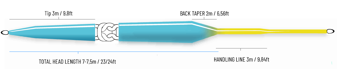The line has a 1,0 m/3 feet back taper which transforms into a comfortable 3,0 meters long ”Handling Line” before the thinner running line kicks in. The Pale Yellow color of the running line extends half way up onto the back taper and indicates the correct line length to keep outside the rod tip for the ultimate rod load when casting. Our advanced TLT (Triple Layer Technology) is controlling both hardness of the coating as well as the buoyancy in various parts of the line. Noticeable in the tip area and also in the harder, more durable and slick handling- and running line.