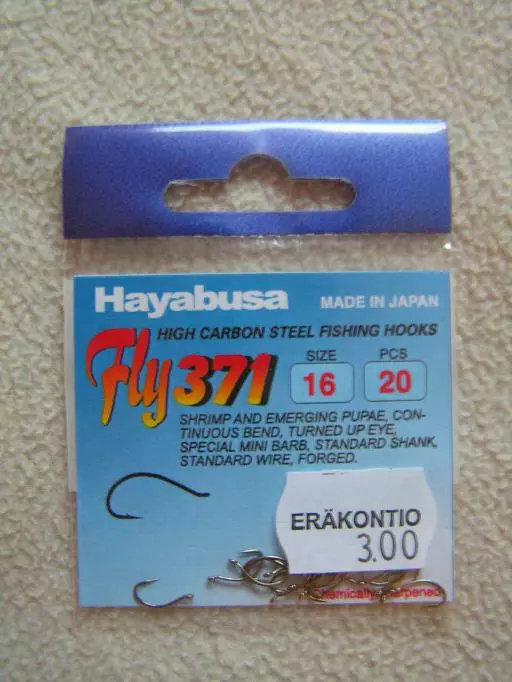 Hayabusan kemiallisesti teroitetut Fly371 perhokoukut, 20kpl pussissa. Shrimp/Pupa-koukku. Ylä-silmäinen koukku. Koot:16.