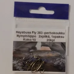 Hayabusan kemiallisesti teroitetut Fly383 perhokoukut, 20kpl pussissa. Nymph/Uppo-koukku. Suorasilmäinen koukku, 2xpitkä, 1xpaksu. Koot:10.