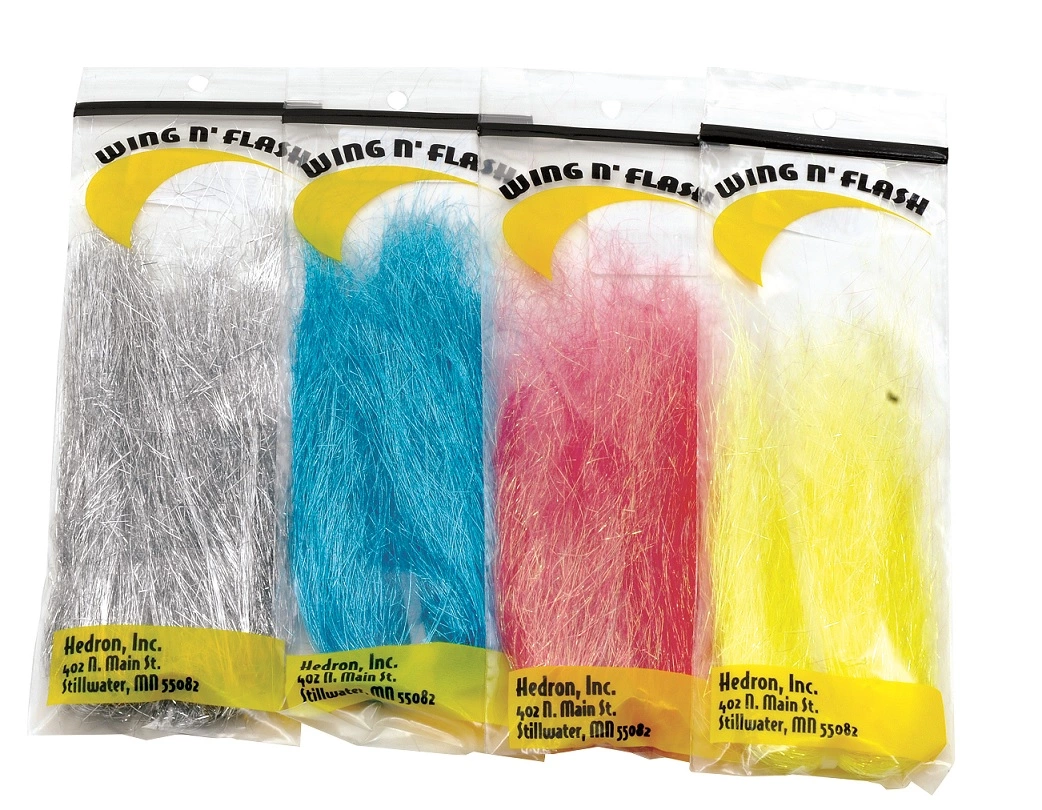 Hedron Wing N’Flashistä tehdään tinseliperhoja. Hedron Wing N’Flash on tinselimateriaaleista pehmein ja siksi siitä on helppo tehdä streamereiden siipiä. Sitä voi sekoittaa karvasiipisten perhojen siipiin kimalteeksi tai siitä voi tehdä myös perhoihin dubbingia. Haukiperhojen hunnuissa käytetään paljon Wing n’Flashiä, koska sen päälle on helppo tehdä epoxypää.