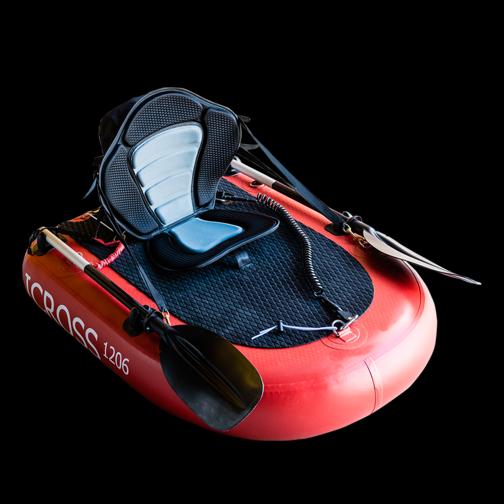 The ICROSS® 1206 comes with an exlusive seat, and in the color red. 1206 also has features like two brackets on each side for mounting a paddle. An EVA non slip seat. A centered, high quality carrying strap. Flexible cord in back for attaching a drybag. Four D-rings on top, to attach seat (sold separately). Four D-rings on the bottom to attach backpack straps. D-ring in front. Flexible cord in front for securing up to three rods.