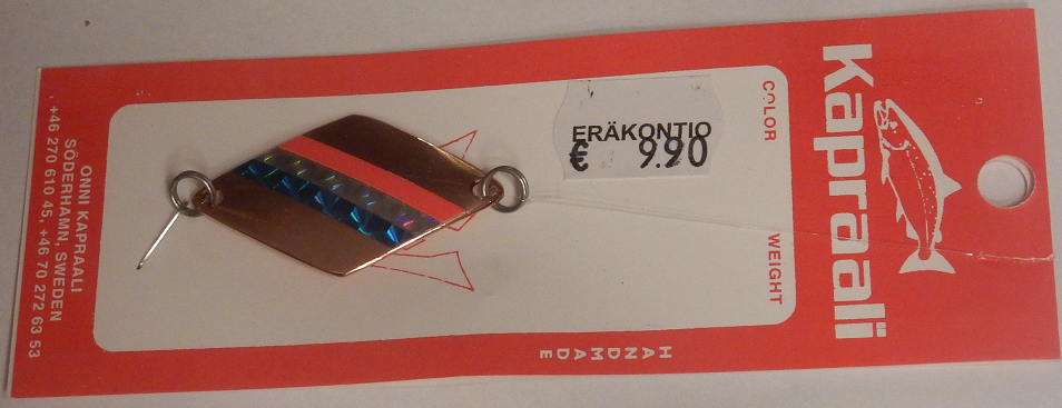 Kapraalin rautupilkki, malli:7,pituus:45mm. Väri:Kupari, keskellä punainen-,hopea- ja sininen teippi-raita.