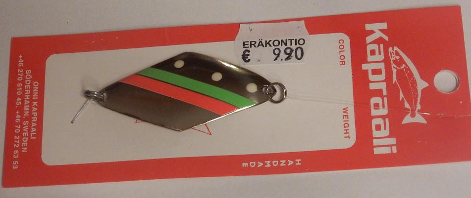 Kapraalin rautupilkki, malli:8,pituus:60mm. Väri:Hopea, keskellä vihreä ja punainen teippi-raita, sekä 3 valkoista pistettä.