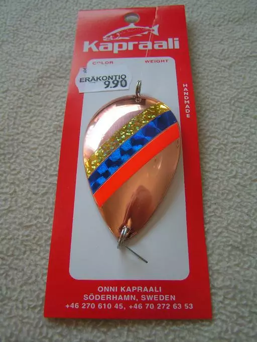 Kapraalin rautupilkki, malli:4,pituus:65mm. Väri:Kupari, keskellä kultainen-,sininen- ja punainen teippi-raita.