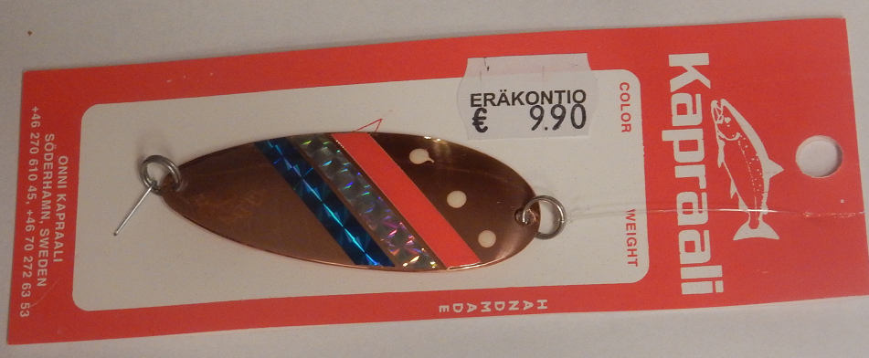 Kapraalin rautupilkki, malli:2,pituus:70mm. Väri:Kupari, keskellä punainen-, hopea- ja sininen -raita, sekä 3 valkoista pistettä.