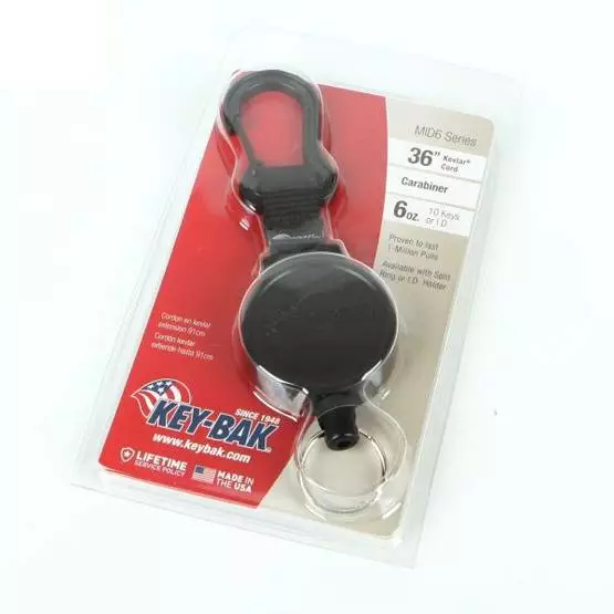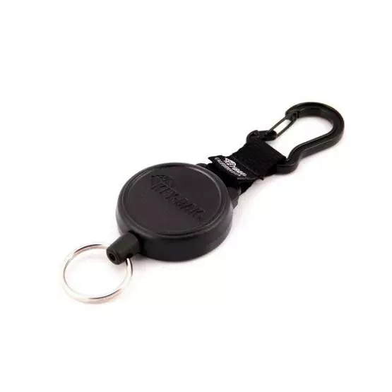 Kelassa on kiinni kätevä karabiini jolla kiinnität kelan esim. vaatteeseen. Päässä avainrengas.