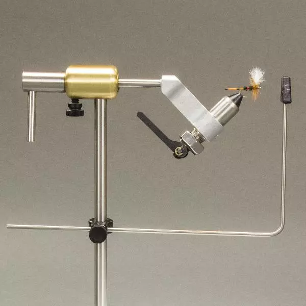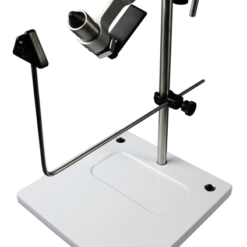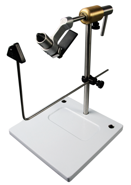 The PEAK Rotary Vise is designed with optimal tying efficiency and ease of adjustment and set-up in mind. We use a range of high-quality materials, chosen to last a lifetime, such as stainless steel, brass, and aircraft aluminum. Hardened and tempered tool steel jaws hold hooks securely, from size 2/0 down to the smallest you can buy. Adjustments are accomplished with minimal effort. The large, stable pedestal base will hold this vise where you set it, and the non-marking feet protect any surface from scuffs and scrapes. The steel base is powder coated white for a durable surface that provides a backdrop you can easily see your materials against. The base also includes an integrated hook/bead pocket with rounded edges for ease of removal, and two accessory post mounting holes (accessory post not included). When traveling, loosening a single set screw allows the vise to be removed, and the base is designed to pack flat. The rotation resistance adjustment screw provides infinite adjustment and is easily manipulated by right or left-handed tiers. A height and length adjustable bobbin cradle are supplied with the vise.