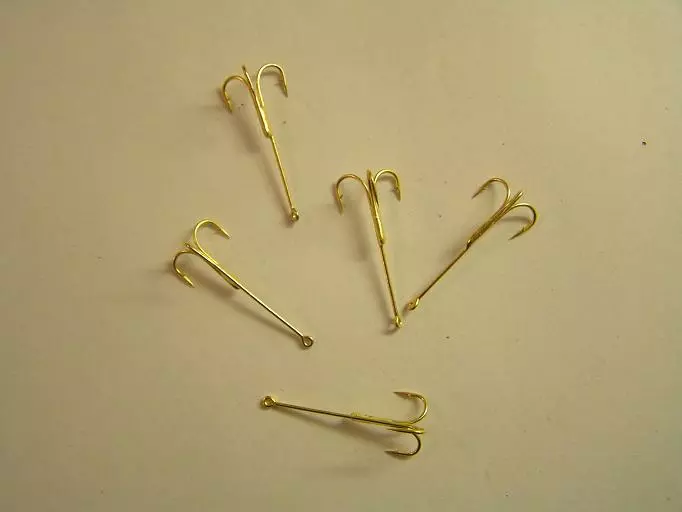 Tasapainopilkkeihin tarkoitettu kullanvärinen 3-haarakoukku, pitkällä rungolla, koko:8, 5kpl pussissa.