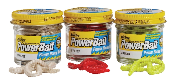 Powerbaitin hunaja-mato, kaksi väriä: valkoinen ja keltainen.