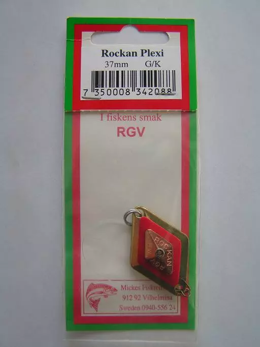 Rockanin Plexi -rautupilkki, suosittu pilkki myös ahvenen pyyntiin. Väri:G/K, eli pohjavärinä messinki, alapuolelta koko messinki, päälypuolelta keskellä punainen ja punaisen keskellä kuparinen salmiakki-kuvio. Koko:37mm.