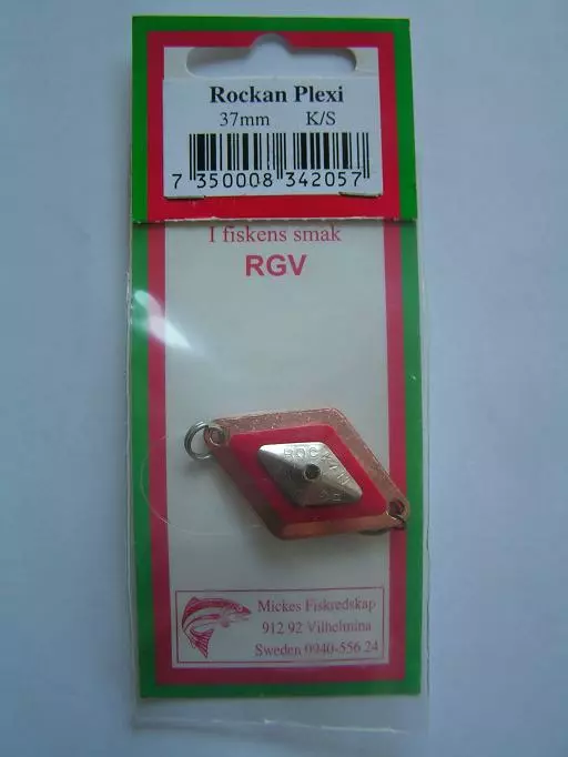 Rockanin Plexi -rautupilkki, suosittu pilkki myös ahvenen pyyntiin. Väri:K/S, eli pohjavärinä kupari, alapuolelta koko kupari, päälypuolelta keskellä punainen ja punaisen keskellä hopeinen salmiakki-kuvio. Koko:37mm.