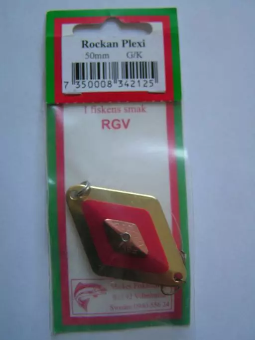Rockanin Plexi -rautupilkki, suosittu pilkki myös ahvenen pyyntiin. Väri:G/K, eli pohjavärinä messinki, alapuolelta koko messinki, päälypuolelta keskellä punainen ja punaisen keskellä kuparinen salmiakki-kuvio. Koko:50mm.