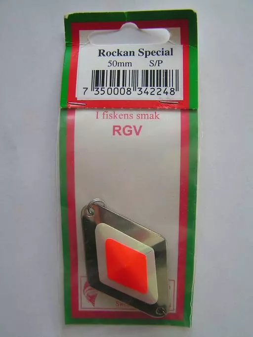 Rockanin Special -rautupilkki, suosittu pilkki myös ahvenen pyyntiin. Väri:S/P, eli pohjavärinä hopea, alapuolelta koko hopea, päälypuolelta keskellä helmiäisen värinen salmiakki-kuvio ja sen keskellä fluori-punainen salmiakki-kuvio. Koko:50mm.