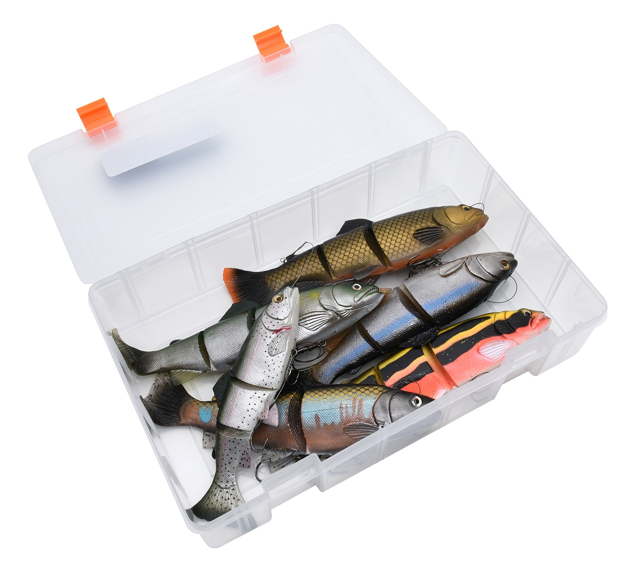 Erittäin fiksu vieherasia, rasia jossa ei ole väliseiniä. Voit helposti käyttää kaikenkokoisia vieheitä ilman että väliseinät ahdistavat vieheitä. Rasia soveltuu myös erittäin hyvin tarvikkeiden, kuten työkalujen ja perukesiimojen säilyttämiseen