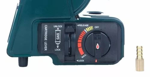 * Liitinkytkentä ulkoisen isomman kaasupullon kytkentään (30mbar / 10mm letku), mukana liitin