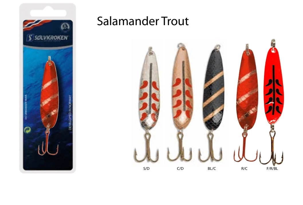 Norjalaisen Solvkrokenin suosittu taimenpyytäjien lusikka-uistin Salamander Trout. Paino:10g.