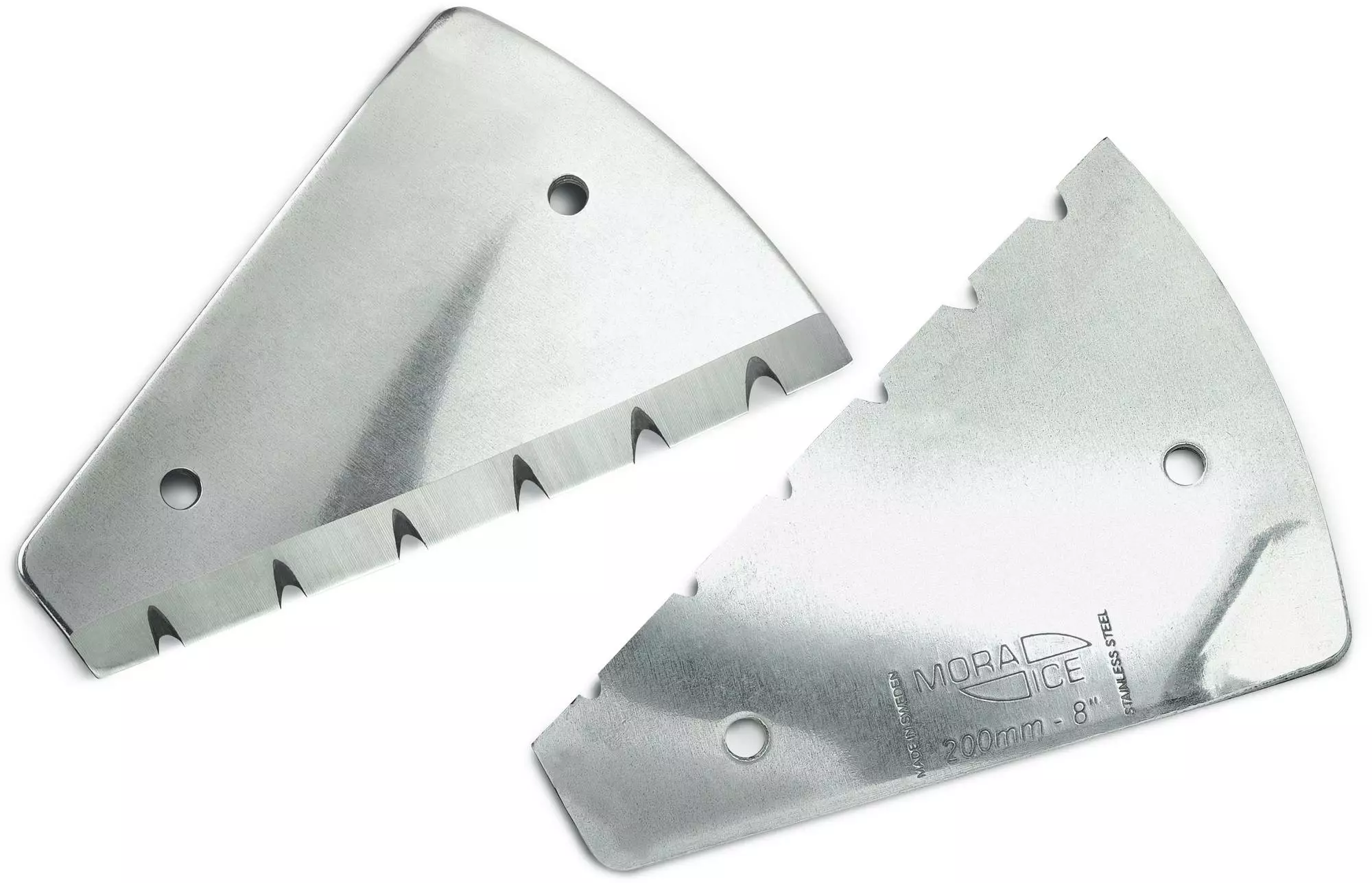 Twin Serrated, Stainless Steel Lazer Blades for Lazer Power Augers. Includes four blade screws and two blades. Lazer Mag, Lazer Mag Xpress, Lazer XL-3000, Electra Lazer, Lazer Pro, Lazer 224 & Lite-Flite.