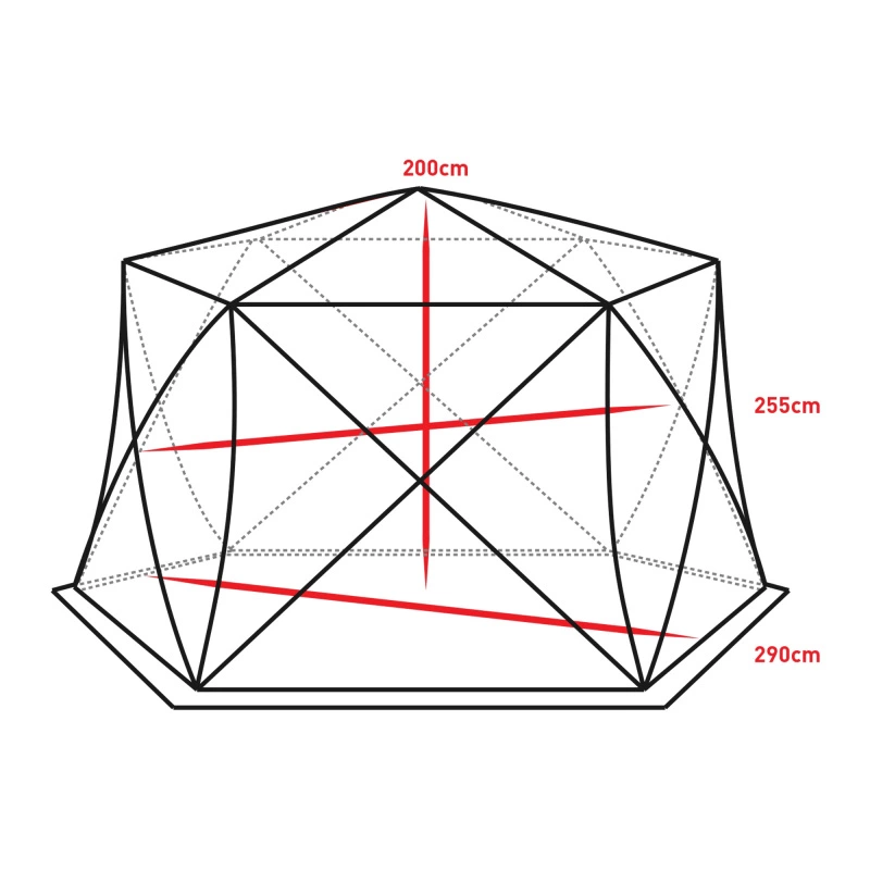 Avonainen pohja ja kulmissa kiinnikkeet teltan ankkuroimiseen jäänkanteen. Mukana tulee säilytys/kantopussi. Mukana 9 ruuvia. Paino 15kg Todella suuri koko: 292x198x310cm.