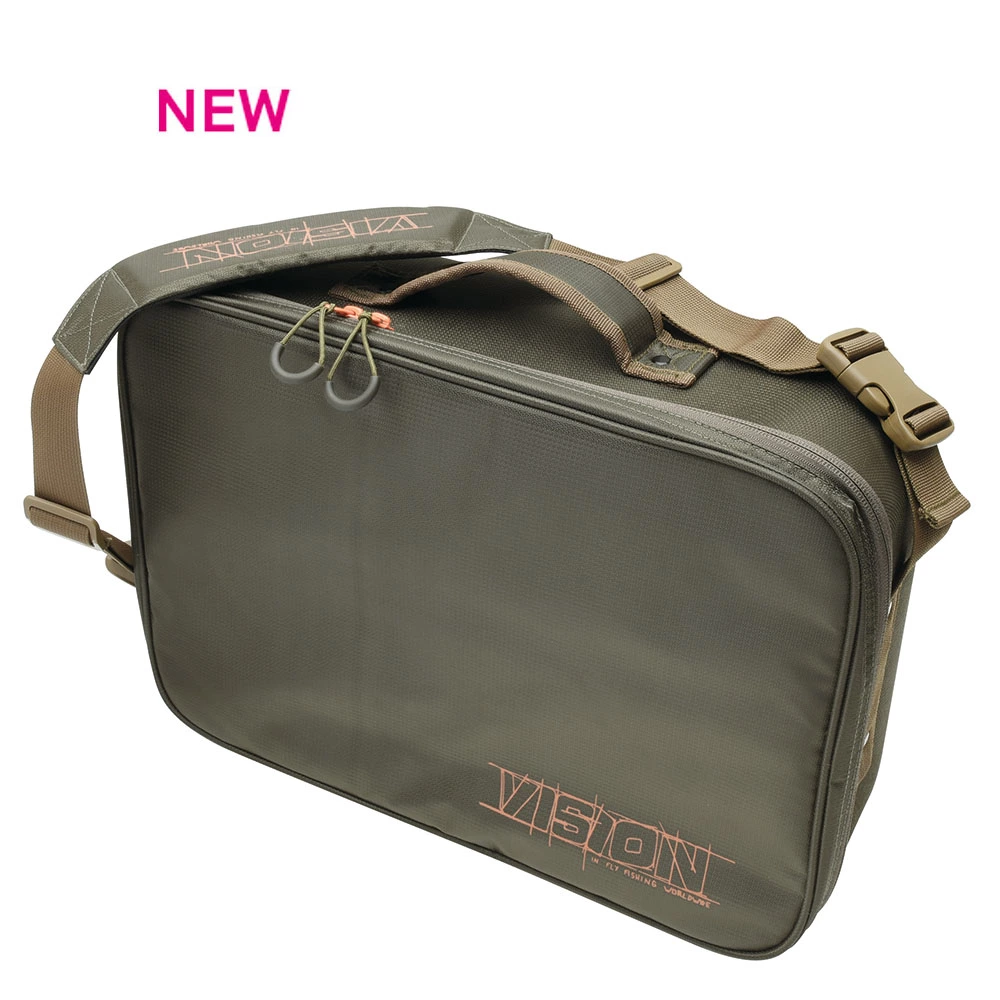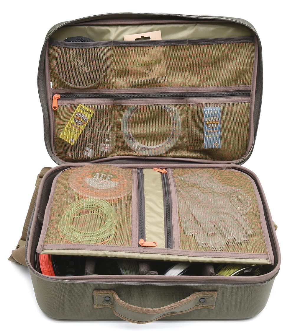 This bag is a real multi-purpose bag for the enthusiastic fly fisherman. It can be used as a spacious reel bag, accommodating a big bunch of differently sized fly reels but thanks to its genius inner wall system you can modify it as you like, according to your needs. In addition to reels you can make a supportive space for your digital SLR or video camera. Or you can use it as a big fly tying bag when travelling. The soft divider gives extra protection when the bag is closed and its numerous zipper pockets keep your small accessories in order and easily accessible. The moulded bottom part is waterproof up to the rivets and stiches, so it can easily be left on the bottom of your boat. Military green colour scheme.