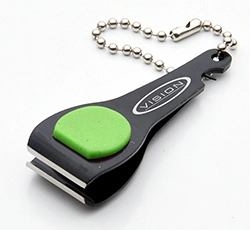 Leveä teräinen siimaleikkuri, jossa iso painallusosa, leikkaa paksuintakin fluorocarbonia helposti.