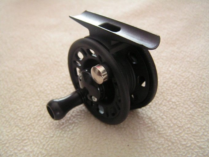 Wigglerin Piru -pilkkikela. Pieni, grafiitti-runkoinen ja jarrullinen kela.